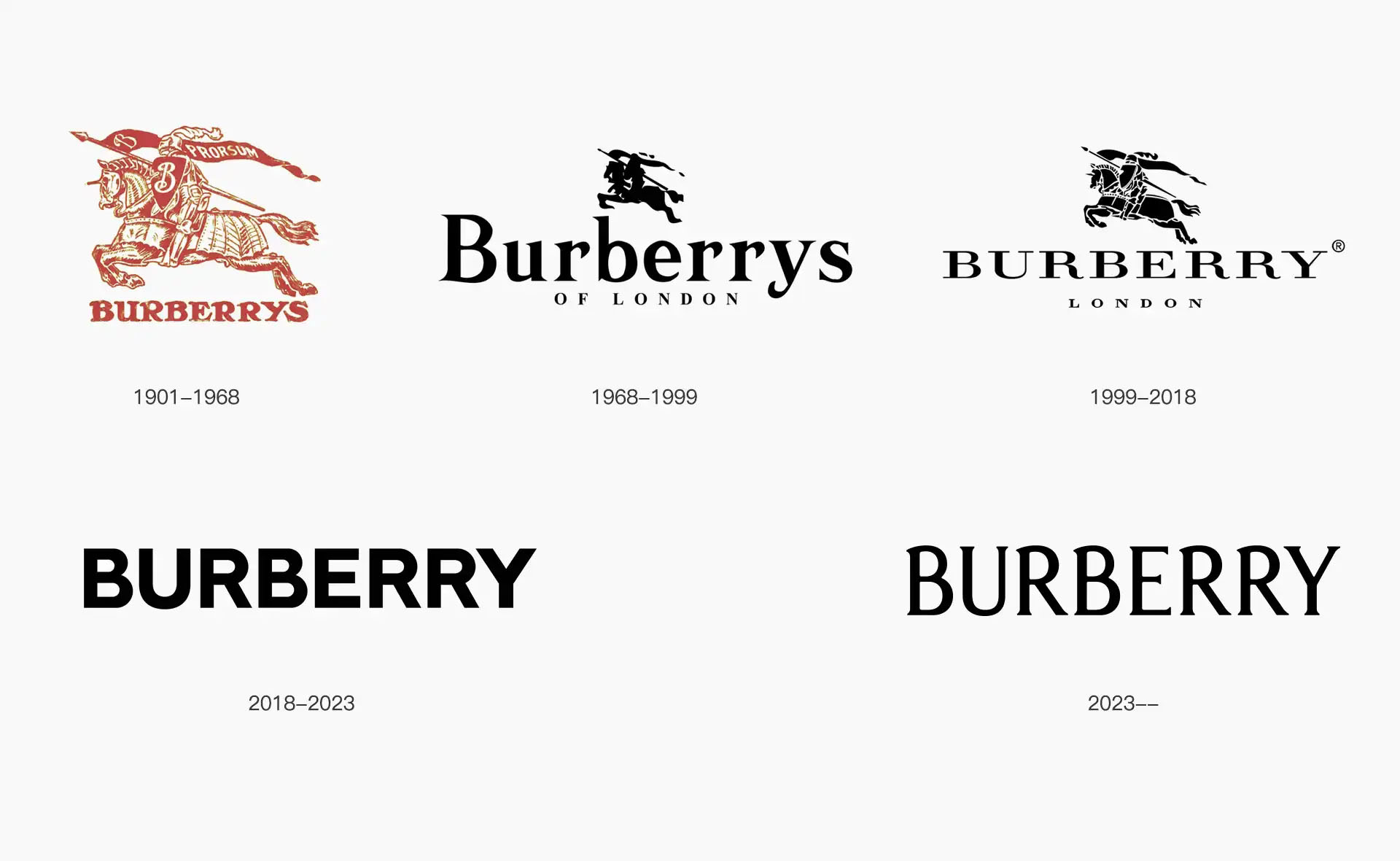 Burberry的LOGO演变历史可以追溯到1856年,当时它在英国成立。其招牌图形标志马术骑士“Equestrian Knight”最早出现在1901年,并在2000年左右被广泛使用。然而,在首席创意官Riccardo Tisci的领导下,马术骑士在2018年后几乎很少出现。