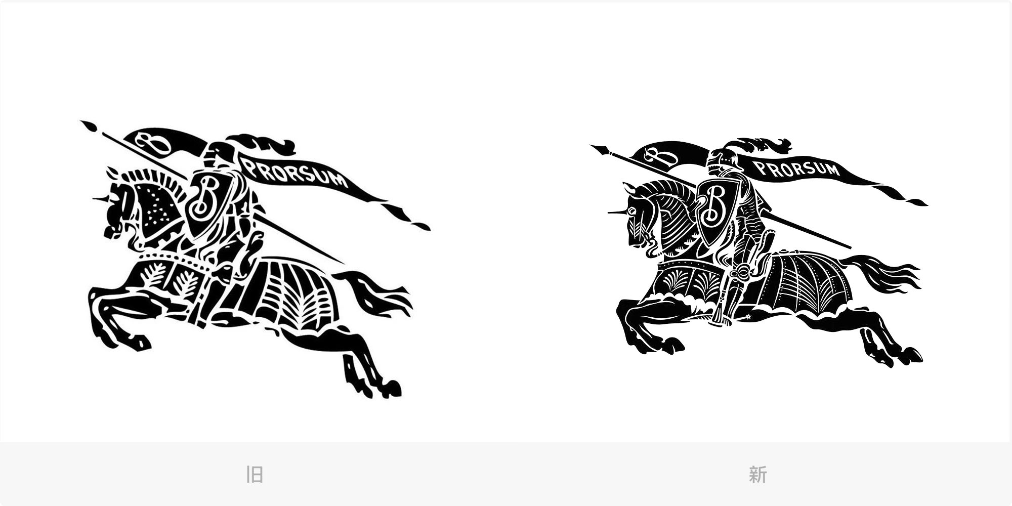 同时,我们还注意到Burberry重新设计了手持盾牌和长矛的骑士图标Equestrian Knight。新图标细节更加丰富,人物和奔马的形态更加自然和协调。长矛上飘扬的旗帜中的字母“B”以及“PRORSUM”字样变得更加清晰。